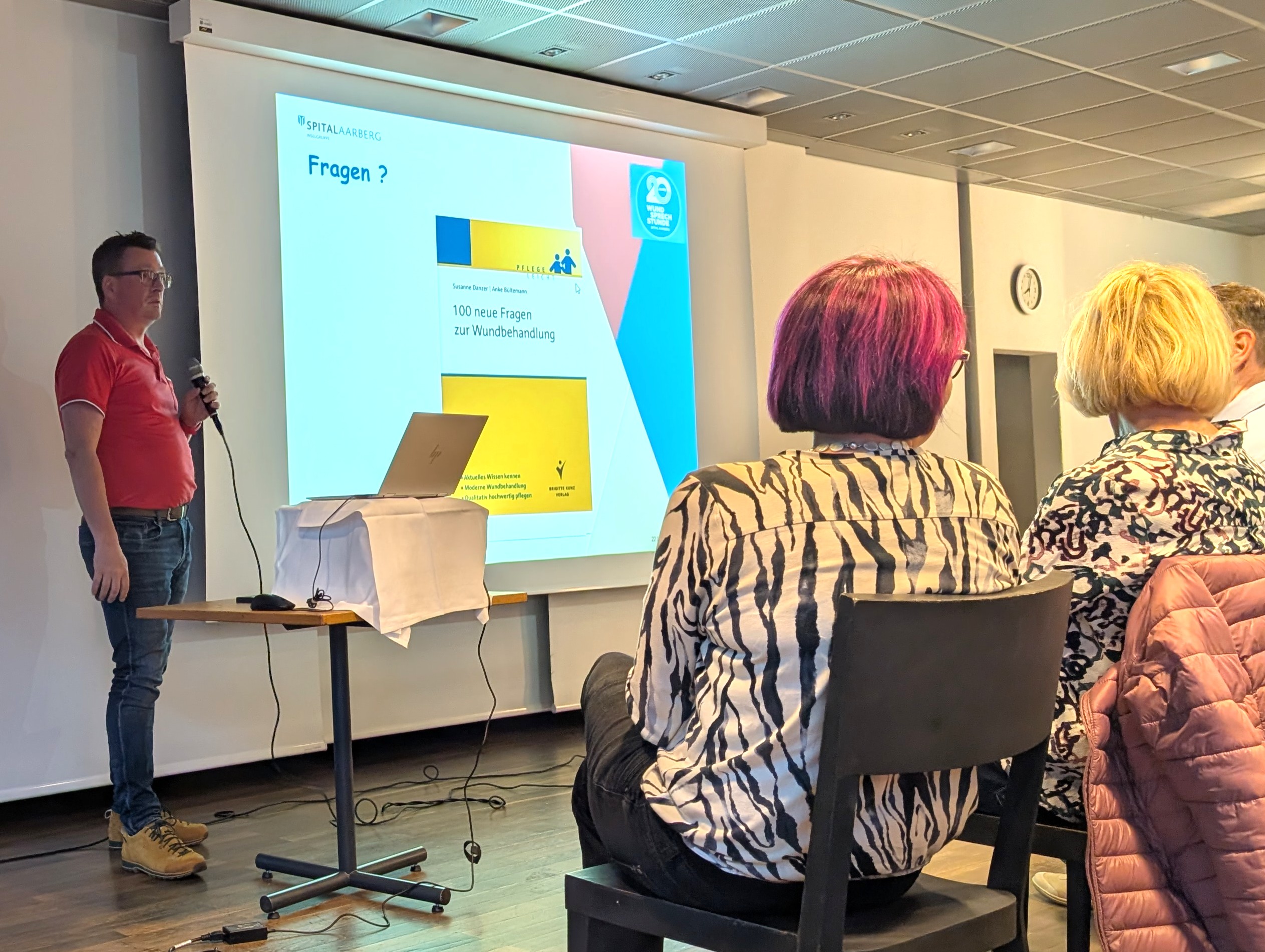Nach dem Vortrag nahm sich das Team der Wundsprechstunde Zeit, um auf persönliche Fragen der Besucherinnen und Besucher einzugehen. Beim anschliessenden Apéro bot sich zudem die Gelegenheit zum informellen Austausch.